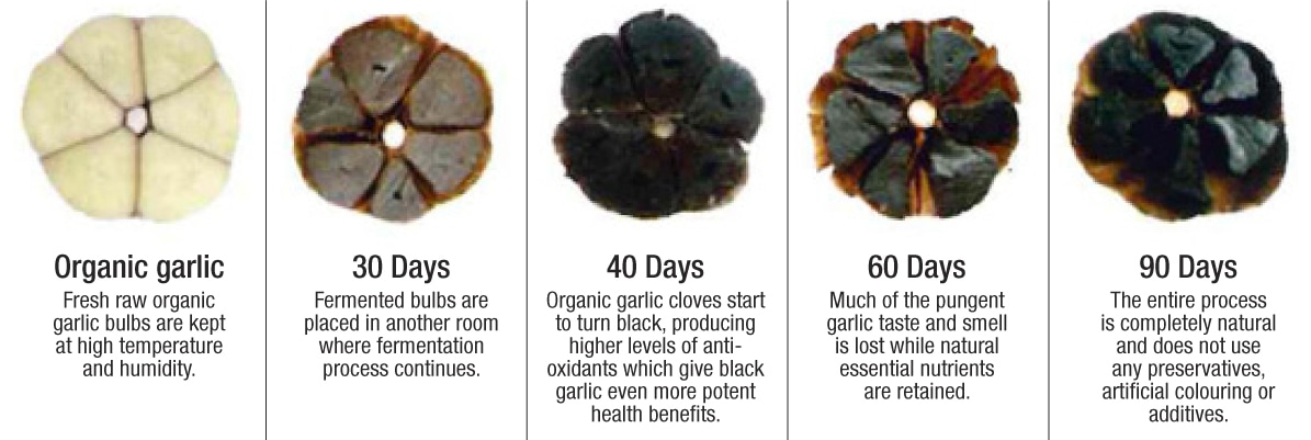 Black garlic is a type of aged garlic that has been fermented under controlled conditions of heat and humidity for several weeks to months. The process of fermentation changes the color, texture, and flavor of the garlic, giving it a unique and complex taste that is different from fresh or roasted garlic.