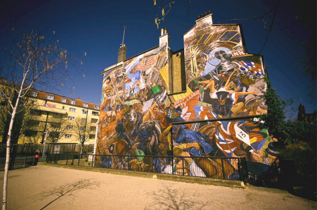 After graduating from the Royal Academy School in 1974, David Savage joined The Public Arts Workshop led by Desmond Rochefort. Together, they collaborated on the Royal Oak Murals in Paddington in 1977, which was unfortunately mostly destroyed. Despite this setback, the success of the Royal Oak Murals led David to be invited by local residents to spearhead the Cable Street Mural Project. From 1977 to 1980, David worked tirelessly to raise funds for a 70-foot high mural depicting the Battle of Cable Street on the wall of the former Stepney town hall on Cable Street. The mural portrays the resistance of the mostly Jewish community against the passage of Oswald Mosley’s fascist Blackshirts on October 4, 1936.